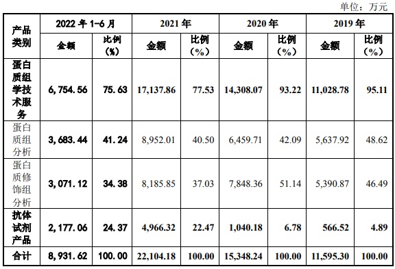 报告期内,公司蛋白质组学技术服务收入分别约为1.10亿元、1.43亿元、1.71亿元和6754.56万元,占主营业务收入的比重分别为95.11%、93.22%、77.53%和75.63%,是公司业绩主要来源。