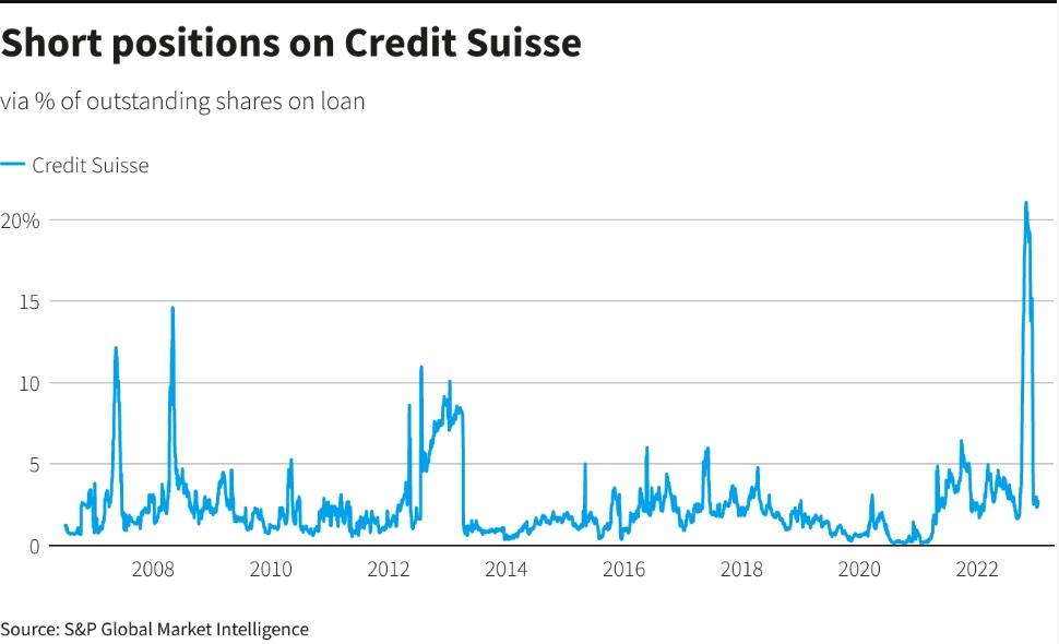 根据标普全球市场情报的数据,截至10月31日,对冲基金和其他投机者借入瑞信逾五分之一的股票进行做空,这是至少自2006年以来的最高水平。