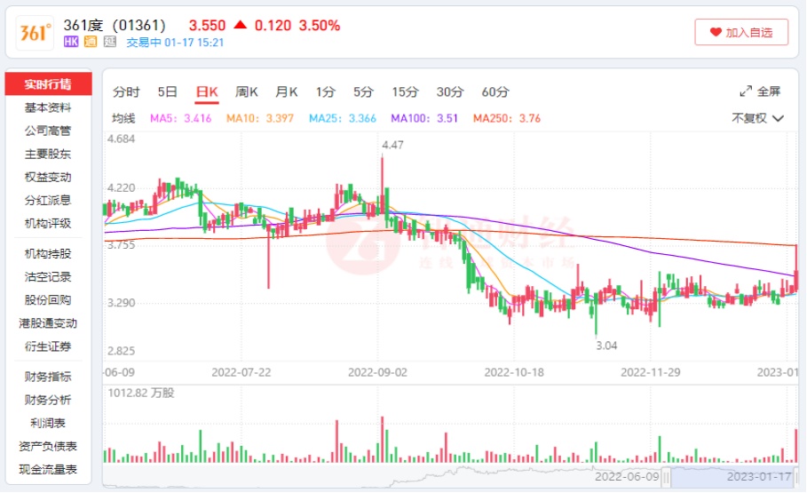 在体育用品板块新一轮行情中,曾在2021年上涨2.7倍的361度(01361),却当了一回“后进生”。2022年11月以来,361度股价总体处于横盘走势中,期间股价低点为3.04港元,高点为3.77港元,最高涨幅为24%。
