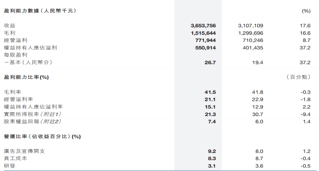 总体而言,由于成本费用增长,使得361度2022年上半年的经营溢利仅同比增长8.7%至7.72亿元。公司权益持有人应占溢利增幅之所以超过37.2%,主要由于公司实际所得税率同比下降9.4个百分点至21.3%,公司所得税开支由上年同期的2.08亿元,下降21.54%至1.63亿元。