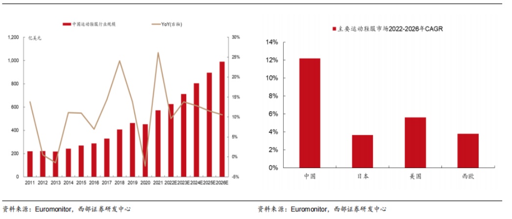 从我国运动鞋服行业发展大势来看,361度在更长远未来将受益于行业发展。2021年我国运动鞋服行业规模约为570亿美元(约为4,000亿元人民币),同比增长26.11%。据Euromonitor数据,2022-2026年我国运动鞋服市场规模CAGR约为12.17%,远超发达国家水平,行业具备较大成长空间。