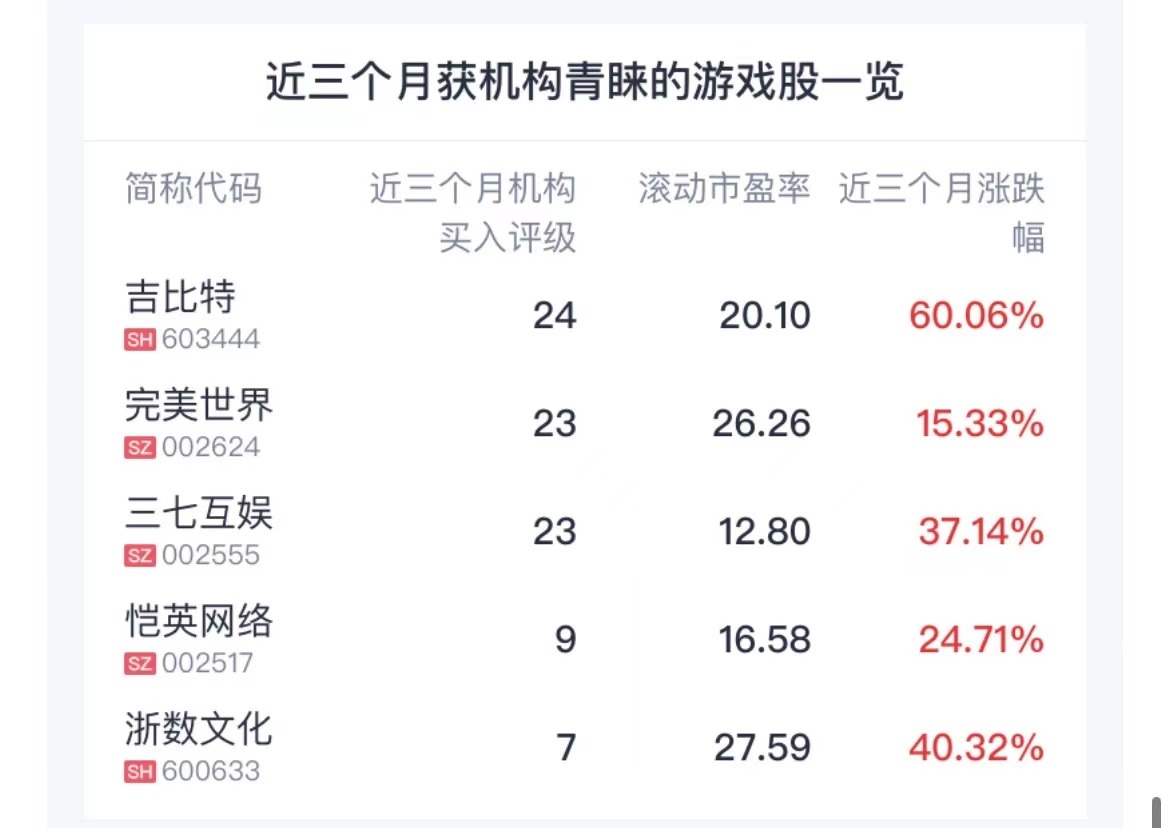 腾讯自选股统计了近三个月获机构青睐的游戏股名单,仅供读者参考。数据显示,近三个月吉比特获24家机构买入评级居首,其次的完美世界、三七互娱均获机构买入评级超20家。