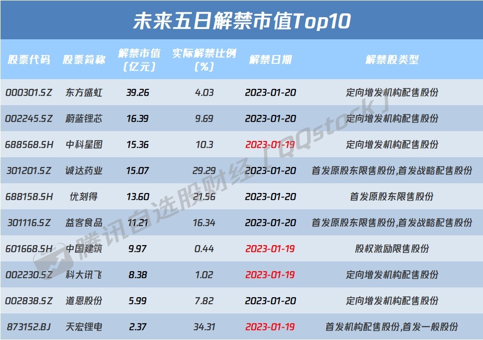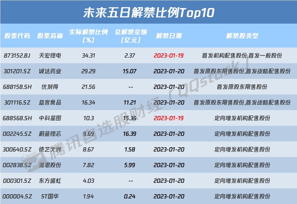 从解禁比例来看,未来五日天宏锂电解禁比例达34.31%,其次解禁比例居前的分别为诚达药业和优刻得;从解禁市值来看,东方盛虹、蔚蓝锂芯、中科星图等股解禁市值居前。
