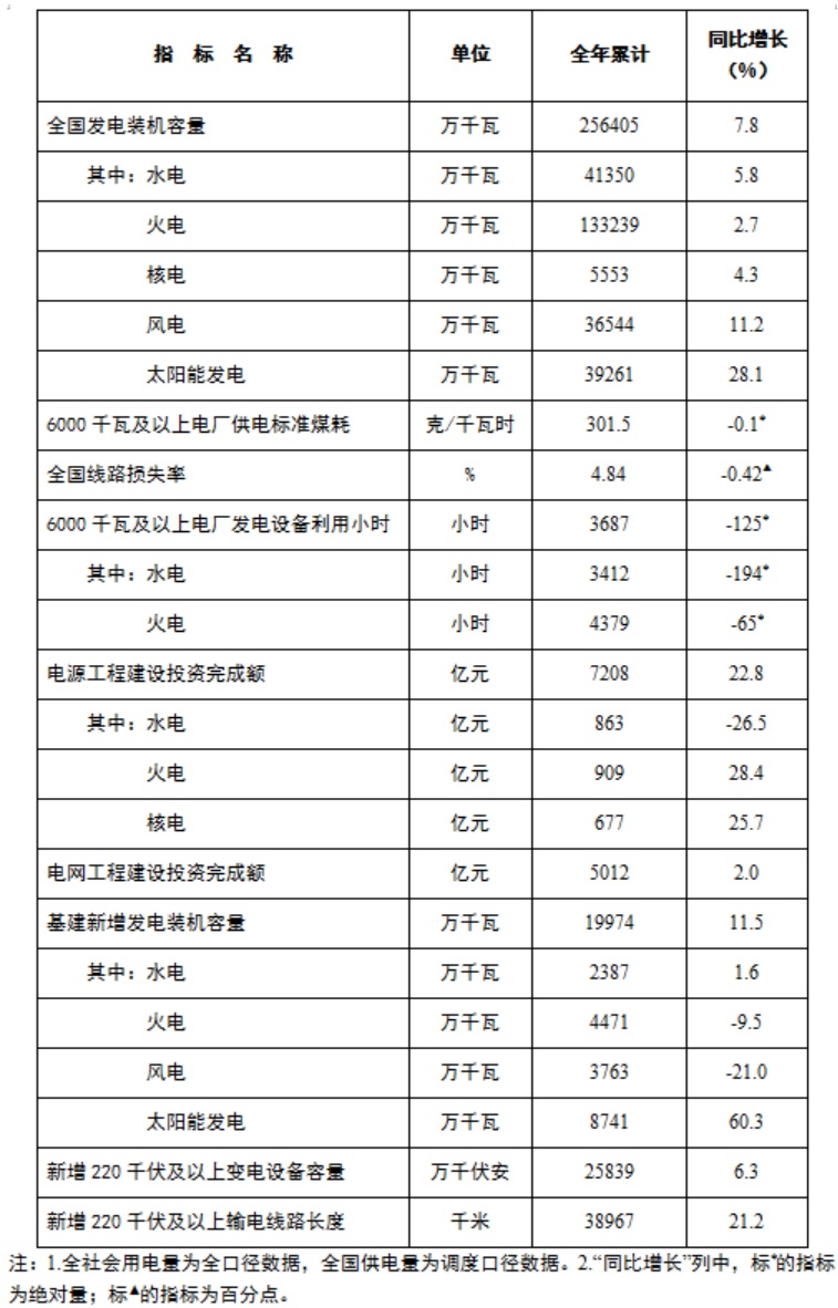 截至12月底,全国累计发电装机容量约25.6亿千瓦,同比增长7.8%。其中,风电装机容量约3.7亿千瓦,同比增长11.2%;太阳能发电装机容量约3.9亿千瓦,同比增长28.1%。