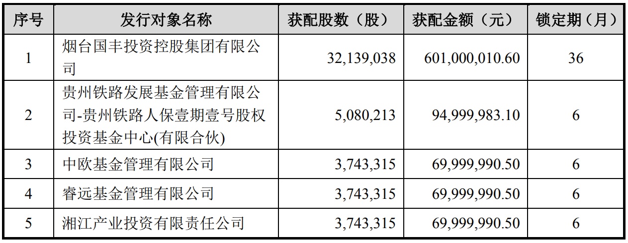 具体来看,中欧基金、睿远基金、大摩、烟台山高致远私募均获配374.33万股,获配金额达7000万元;财通基金获配1213.9万股,获配金额达2.27亿元。此外,诺德基金获配8000万元、工银瑞信基金获配2.1亿元、大成基金获配5.58亿元、国泰君安证券获配1.49亿元。