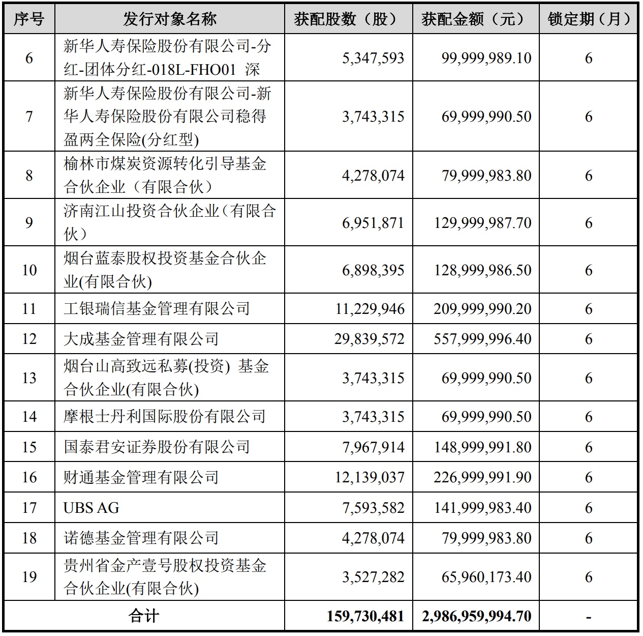 公告显示,此次发行价格为18.70元/股,发行股数约1.597亿股,募集资金总额约29.87亿元。此次发行对象最终确定为19位,包括中欧基金、睿远基金、财通基金等多家公募。