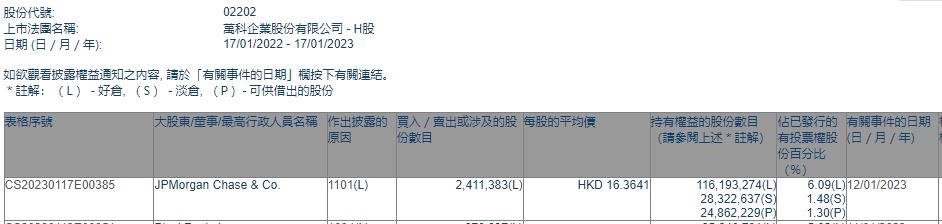 智通财经APP获悉,香港联交所最新资料显示,1月12日,小摩增持万科企业(02202)241.1383万股,每股作价16.3641港元,总金额约为3946.01万港元。增持后最新持股数目约为1.16亿股,最新持股比例为6.09%。