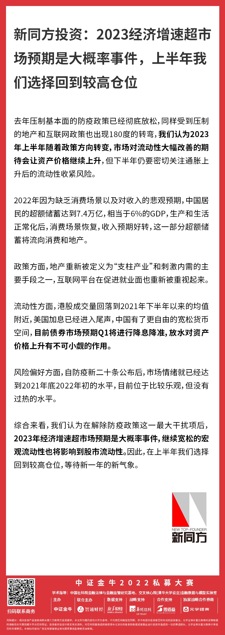 智通财经APP获悉,由元宇证券独家战略支持的中证金牛2022私募大赛于12月1日正式启动,赛事正如火如荼开展。2023新年伊始,参赛机构深圳市新同方投资管理有限公司发表“新同方年度宏观策略回顾与展望”一文。新同方投资认为在解除防疫政策这一最大干扰项后,2023年经济增速超市场预期是大概率事件,继续宽松的宏观流动性也将影响到股市流动性。因此,新同方投资在上半年选择回到较高仓位。鉴于去年压制基本面的防疫政策已经彻底放松,同样受到压制的地产和互联网政策也出现180度的转弯,新同方投资认为2023年上半年随着政策方向转变,市场对流动性大幅改善的期待会让资产价格继续上升,但下半年仍要密切关注通胀上升后的流动性收紧风险。