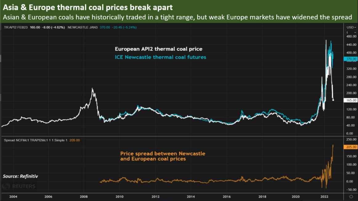 欧洲和亚洲煤炭市场的不同基调,体现在它们之间创纪录的价差上。