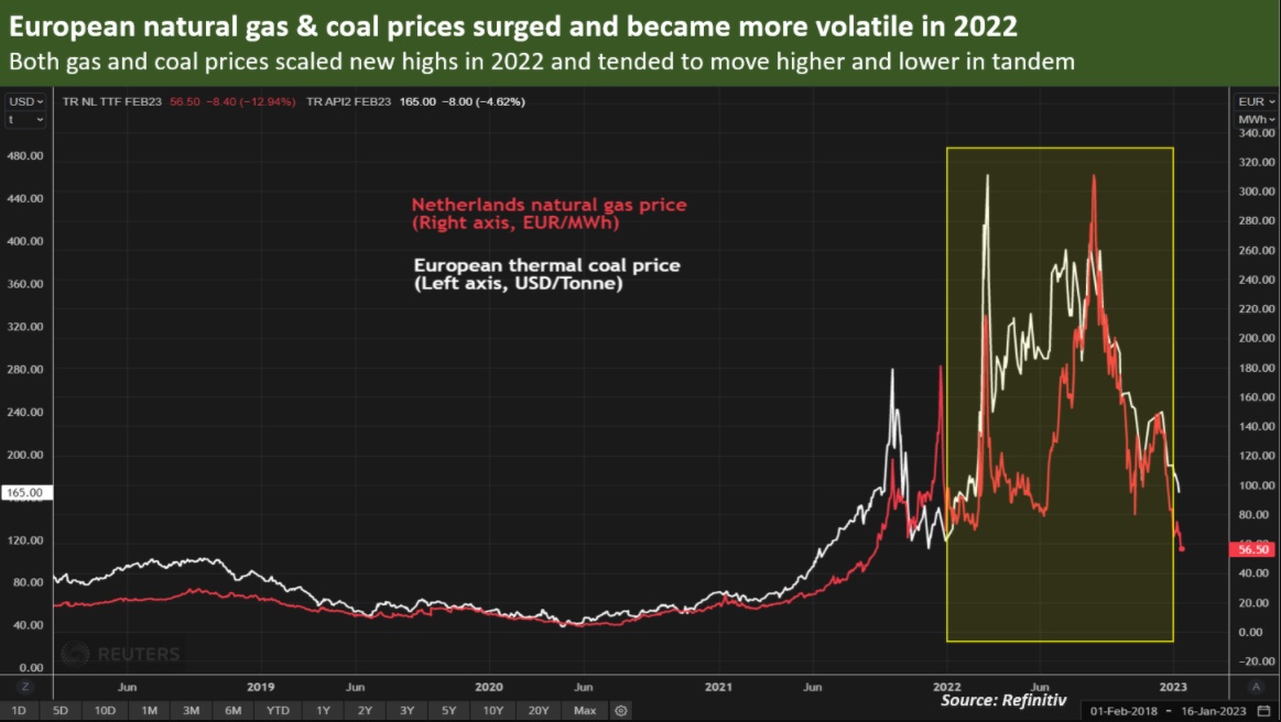 然而,由于最近欧洲天然气价格暴跌——自去年12月1日以来,由于冬季气温温和、储气罐装满以及工业使用量减少,欧洲天然气价格下降了60%——2023年迄今为止,欧洲煤炭价格和需求已大幅下降。