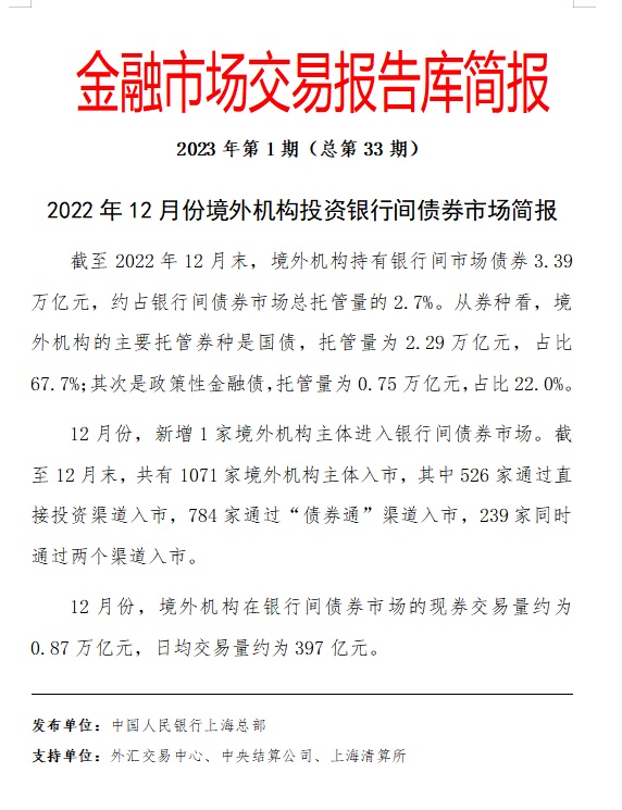 12月份,境外机构在银行间债券市场的现券交易量约为0.87万亿元,日均交易量约为397亿元。