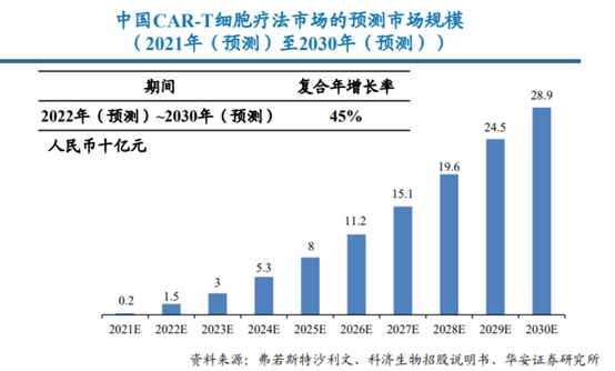 根据Frost&Sullivan预测,2021年国内CAR-T疗法的市场规模约为人民币2亿元,未来在癌症患者增加、政策优惠、患者负担能力提高的推动下,2030年将增至289亿元,2022年至2030年的复合年增长率高达45.0%。
