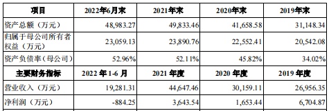财务方面,于2019年、2020年、2021年及2022年上半年,公司实现营业收入分别约为2.70亿元、3.02亿元、4.46亿元以及1.93亿元;同期,实现净利润分别约为6704.87万元、1653.44万元、3643.54万元以及-884.25万元。