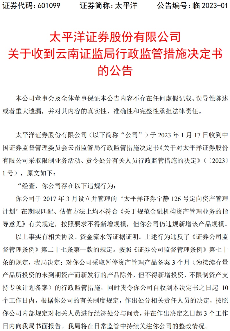 智通财经APP获悉,1月17日晚,太平洋(601099.SH)发布公告称,收到云南证监局行政监管措施决定书,这也是2023年开年以来首份券商资管罚单。