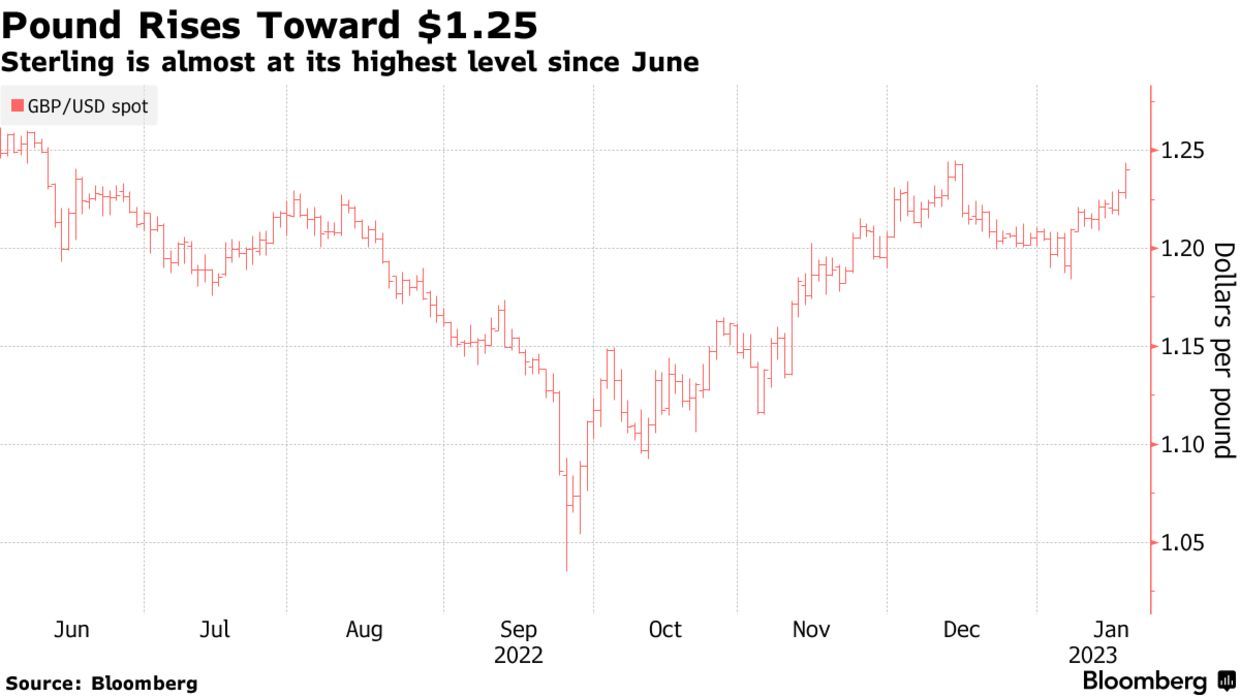 智通财经APP获悉,由于美国12月零售销售、PPI和工业产出数据均弱于预期,市场对美联储将进一步放缓加息步伐的预期升温。美元因此承压,并提振了英镑等非美货币。英镑兑美元汇率连续第二天上涨,涨幅达1.2%,至1.2436,为去年6月以来的最高水平。