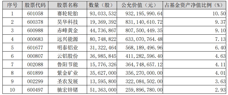 截至四季度末,该基金前十大重仓股分别为赛轮轮胎(601058.SH)、昊华科技(600378.SH)、赤峰黄金(600988.SH)、远兴能源(000683.SZ)、明泰铝业(601677.SH)、云铝股份(000807.SZ)、鲁阳节能(002088.SZ)、紫金矿业(601899.SH)、圣农发展(002299.SZ)、驰宏锌锗(600497.SH)。