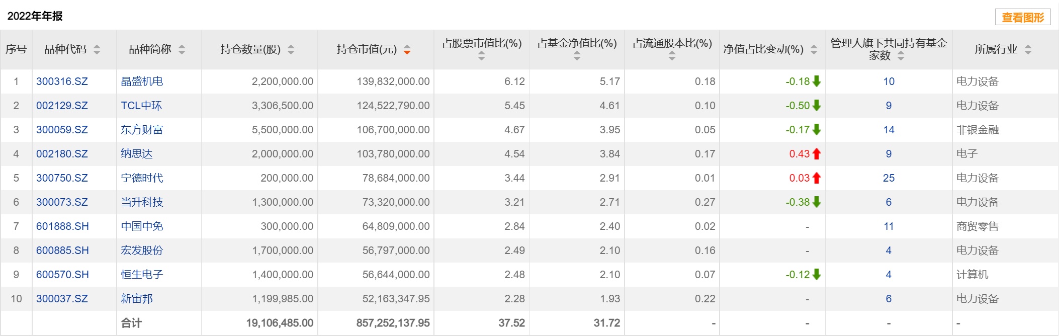该基金的前十大重仓股分别是晶盛机电(300316.SZ)、TCL中环(002129.SZ)、东方财富(300059.SZ)、纳思达(002180.SZ)、宁德时代(300750.SZ)、当升科技(300073.SZ)、中国中免(601888.SH)、宏发股份(600885.SH)、恒生电子(600570.SH)、新宙邦(300037.SZ)。
