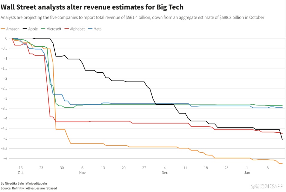 分析师已经将Meta、亚马逊、苹果(AAPL.US)、Alphabet(GOOG.US)和微软(MSFT.US)这五家公司的总营收预测从去10月份的预期下调了5%,至5614亿美元。