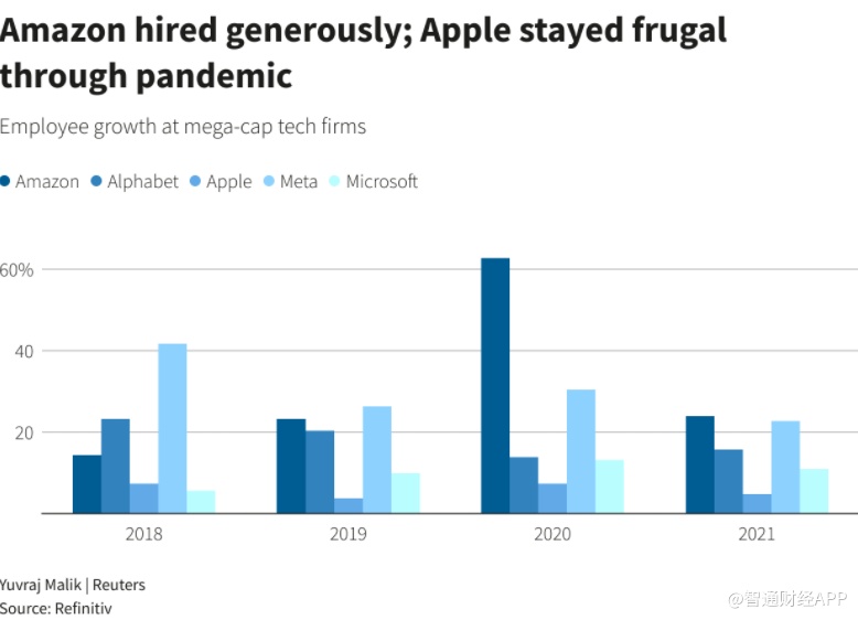 这五家科技巨头在2020年和2021年的员工人数平均增加了45%和20.5%,其中苹果公司的员工增速最温和。