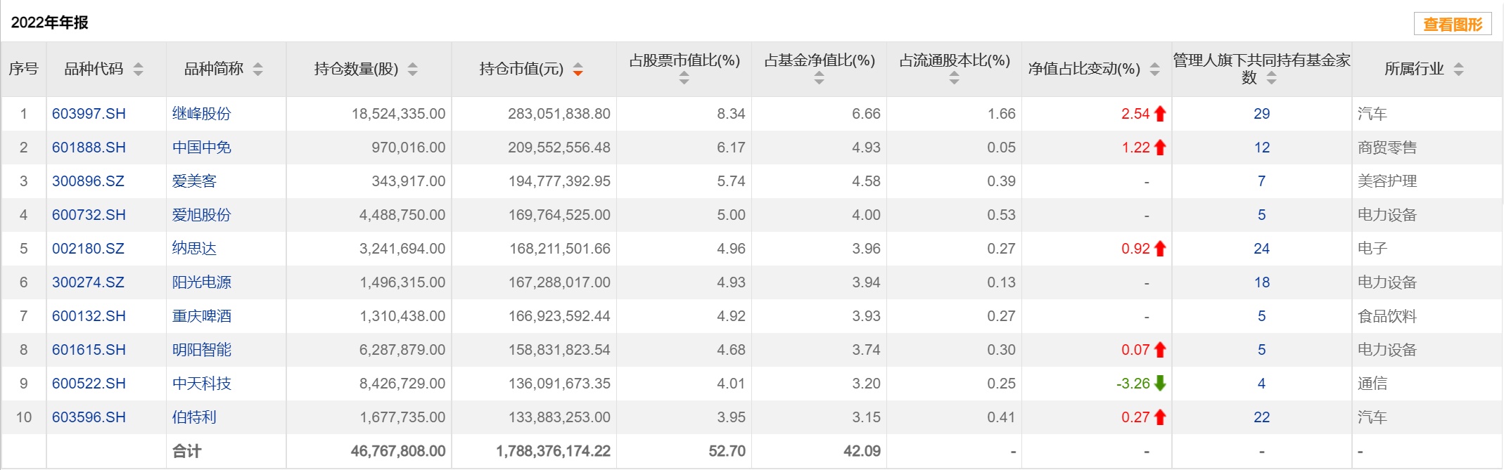 四季报数据显示,该基金前十大重仓股分别为继峰股份(603997.SH)、中国中免(601888.SH)、爱美客(300896.SZ)、爱旭股份(600732.SH)、纳思达(002180.SZ)、阳光电源(300274.SZ)、重庆啤酒(600132.SH)、明阳智能(601615.SH)、中天科技(600522.SH)、伯特利(603596.SH)。