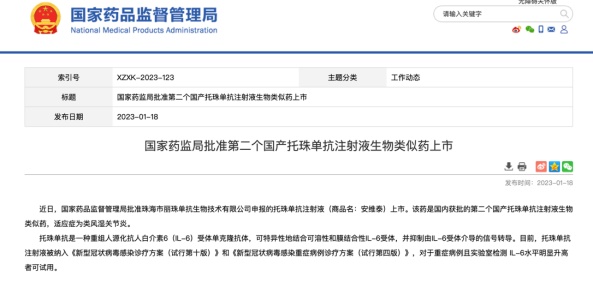 2023年1月,中华医学会呼吸病学分会危重症学组、中国医师协会呼吸医师分会危重症医学专家组发布了《奥密克戎变异株所致重症新型冠状病毒感染临床救治专家推荐意见》,明确指出托珠单抗IL-6拮抗剂能够抑制重症患者过激的炎症反应。