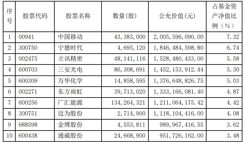 从具体的持仓情况来看,该基金持有中国移动(00941)4338.3万股,占比7.32%,为该基金第一大重仓股。