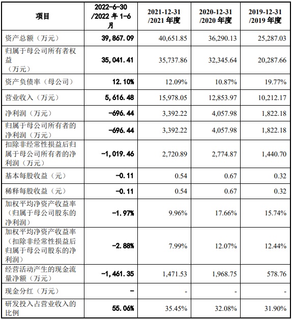 财务方面,招股书显示,于2019年、2020年、2021年及2022年上半年,公司实现营业收入分别约为1.02亿元、1.29亿元、1.60亿元以及5616.48万元;同期,实现净利润分别约为1822.18万元、4057.98万元、3392.22万元以及-696.44万元。