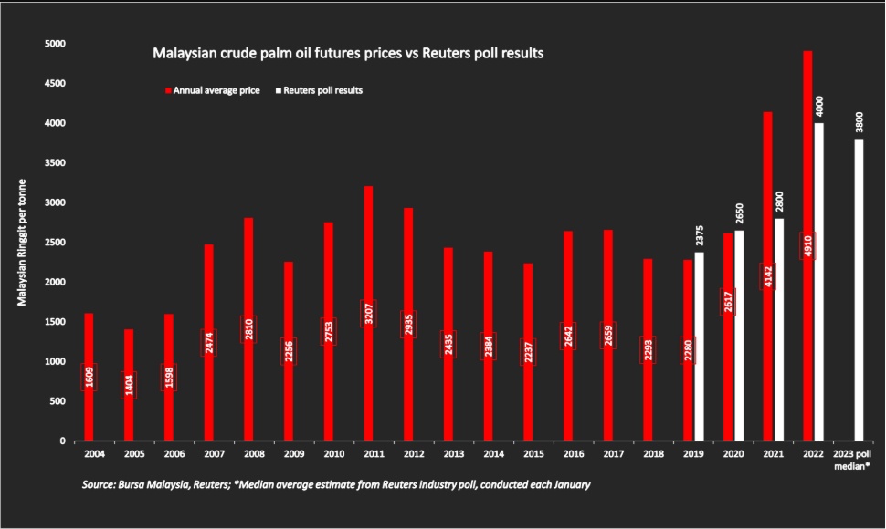 根据对18位分析师和业内人士的调查,2023年基准棕榈油价格平均将达到每吨3800林吉特,较去年创纪录的4910林吉特下降23%。