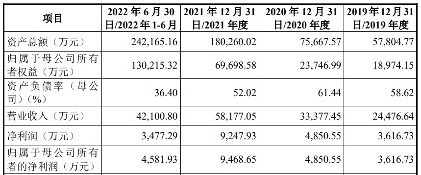 财务方面,于2019年、2020年、2021年及2022年上半年,公司实现营业收入分别约为2.45亿元、3.38亿元、5.82亿元以及4.21亿元;同期,实现净利润分别约为3616.73万元、4850.55万元、9247.93万元以及3477.29万元。