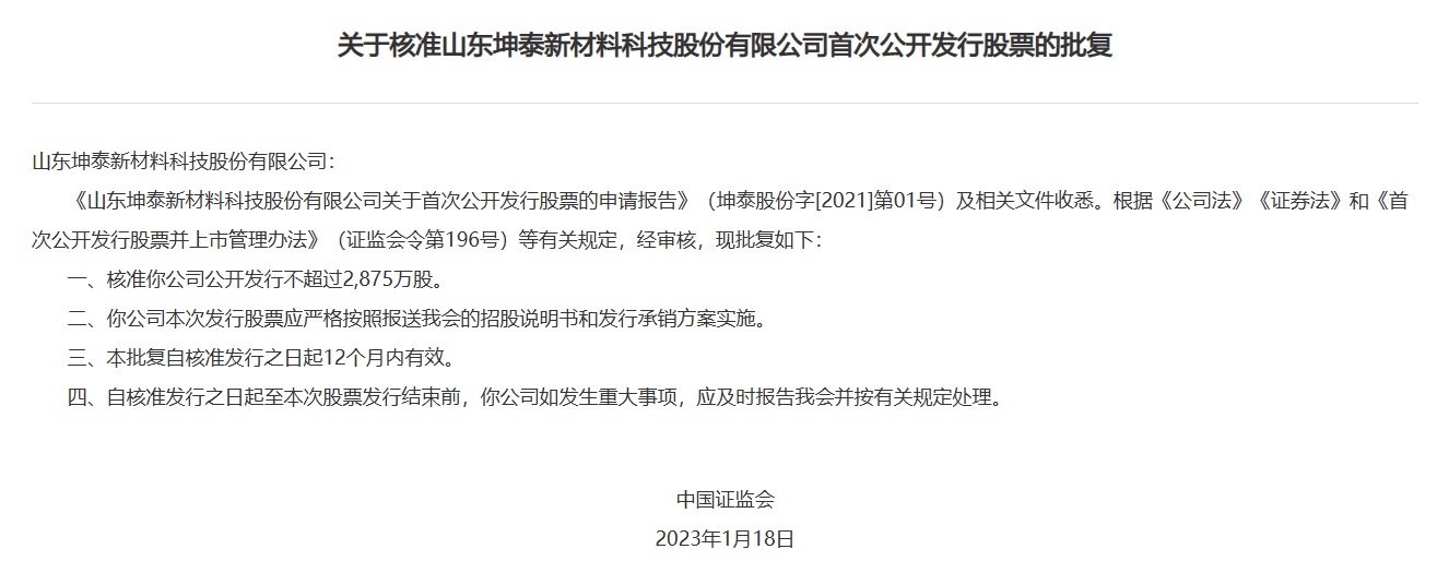 智通财经APP获悉,1月18日,证监会发布核准山东坤泰新材料科技股份有限公司(坤泰股份)首次公开发行股票的批复。证监会表示,核准坤泰股份公开发行不超过2875万股。