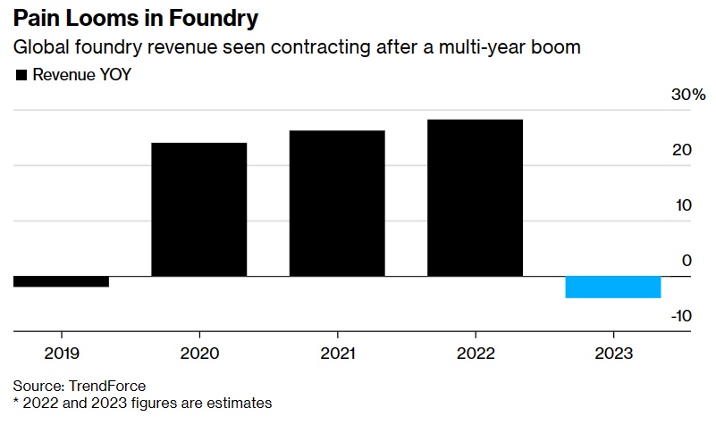 由于市场对先进制程芯片的需求迅速降温,TrendForce预计今年全球芯片代工厂商(foundries)的整体营收将出现下降,而这些先进芯片制造商们支撑着亚洲的科技驱动型经济体,比如中国台湾和韩国。