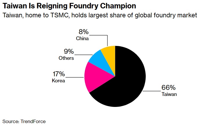 据TrendForce估计,截至去年,代工行业(该行业包括为苹果公司的iPhone和MacBook生产芯片产品)价值接近1300亿美元。台积电遥遥领先,三星电子紧随其后,目前这家韩国竞争对手仍然是全球最大规模的存储芯片制造商。