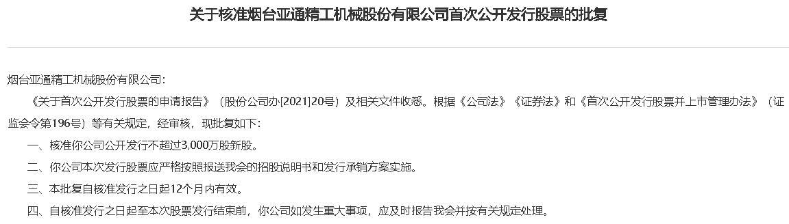 智通财经APP获悉,1月19日,中国证监会网站发布关于核准烟台亚通精工机械股份有限公司首次公开发行股票的批复,核准其公开发行不超过3000万股新股。东吴证券为其保荐机构,拟募资11.94亿元。