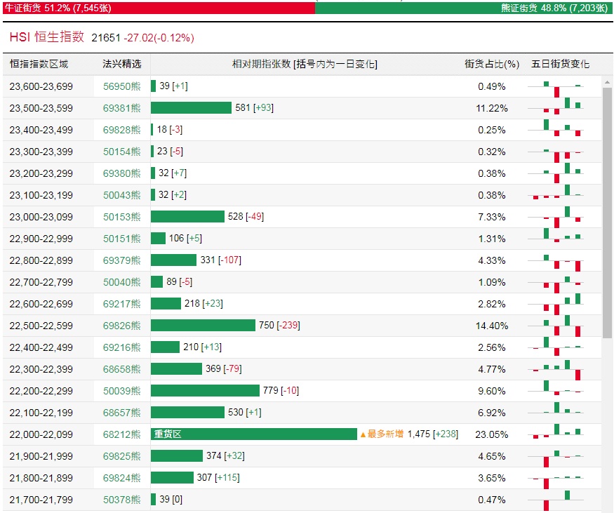 法兴恒指牛熊证街货分布图中的数据显示,熊证街货重货区和最多新增都在22000-22099区间,该区间最新熊证数量为1475张,较上一交易日增加238张。
