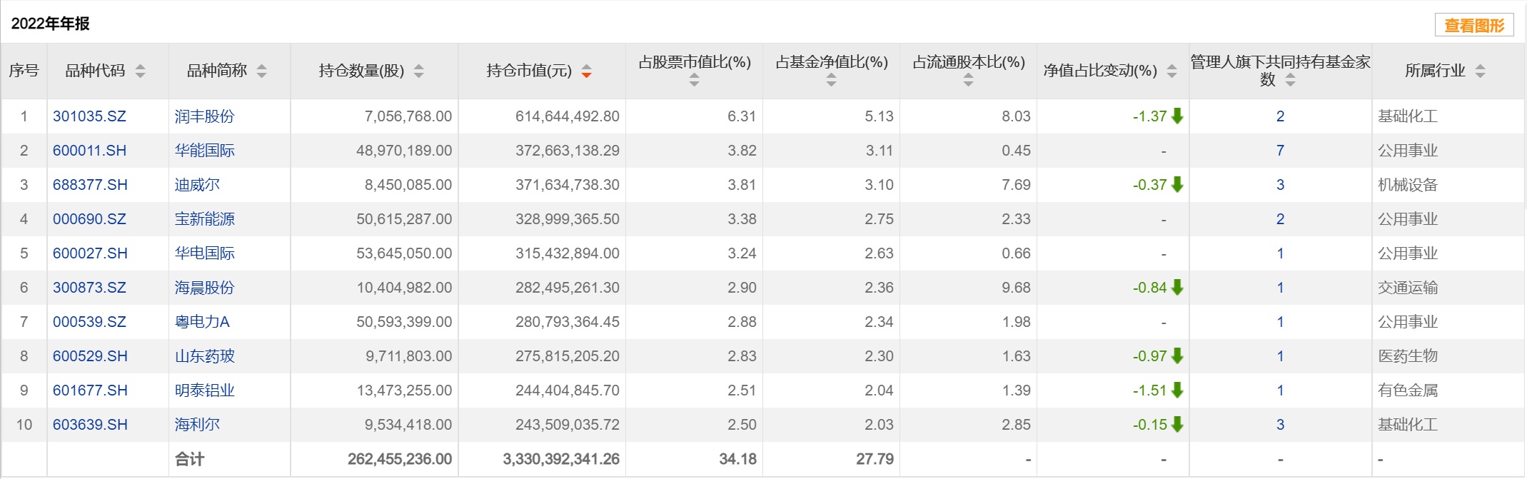 重仓股方面,该基金前十大重仓股分别为润丰股份(301035.SZ)、华能国际(600011.SH)、迪威尔(688377.SH)、宝新能源(000690.SZ)、华电国际(600027.SH)、海晨股份(300873.SZ)、粤电力A(000539.SZ)、山东药玻(600529.SH)、明泰铝业(601677.SH)、海利尔(603639.SH)。