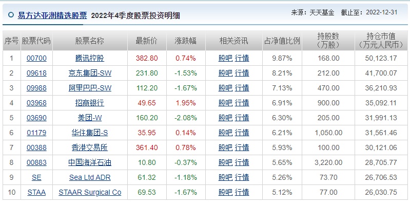 在上述四支基金中,易方达亚洲精选增幅最大,单季度超过10%。与2022年三季度末相比,前十大重仓股未发生变动,其中腾讯控股(00700)持仓比例增加至9.87%跃升至第一大重仓股,京东集团-SW(09618)、阿里巴巴-SW(09988)、招商银行(03968)、中国海洋石油(00883)、香港交易所(00388)的数量不变。