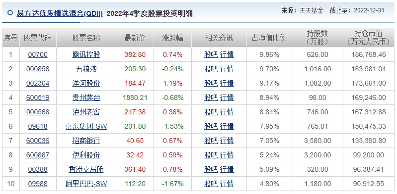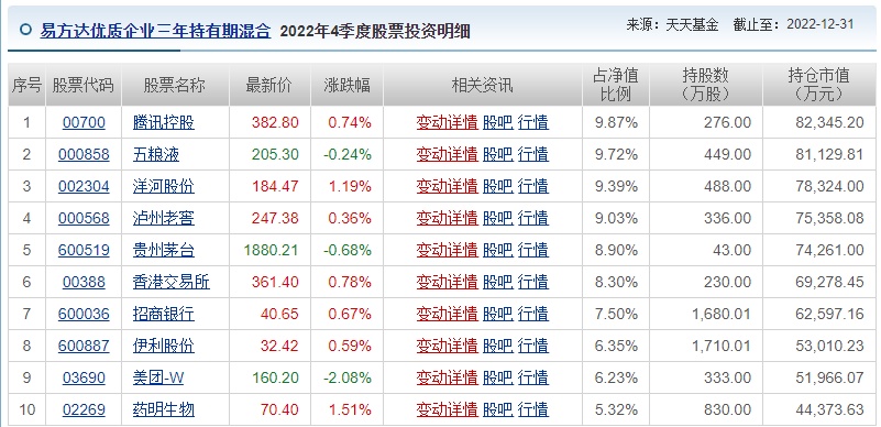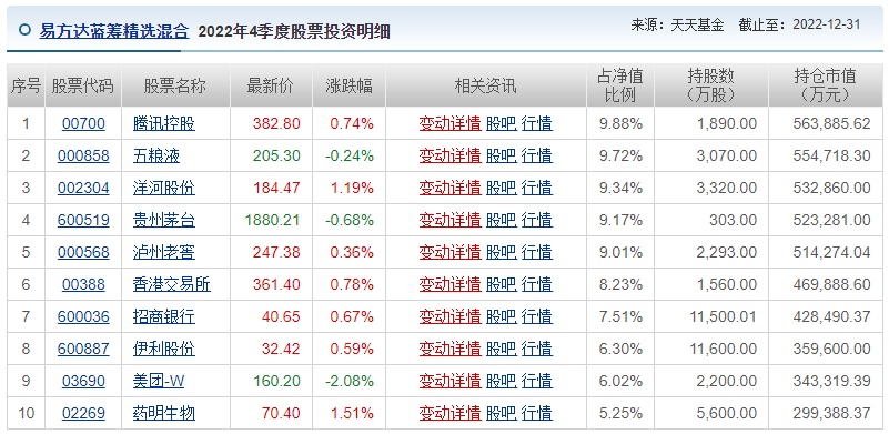 与2022年三季度末相比,易方达蓝筹精选的前十大重仓股未发生变动,前十大重仓股有腾讯控股、五粮液(000858.SZ)、洋河股份(002304.SZ)、贵州茅台(600519.SH)、泸州老窖(000568.SZ)、香港交易所、招商银行、伊利股份(600887.SH)、美团-W(03690)和药明生物(02269)。