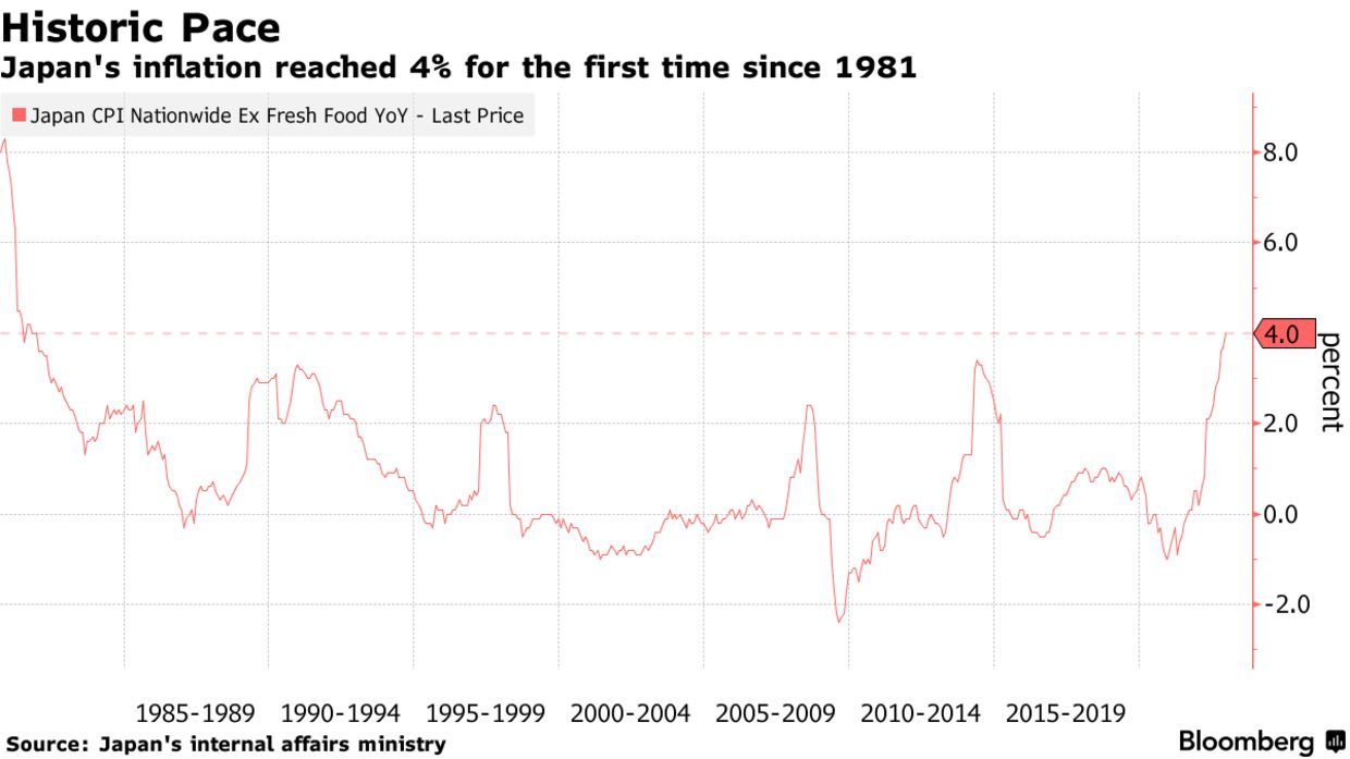智通财经APP获悉,日本内务省周五公布的数据显示,日本12月不含生鲜食品的核心消费者价格指数(CPI)同比涨幅为4%,符合市场预期,为1981年以来的最高水平,高于11月的3.7%;日本12月整体CPI同比涨幅为4%,符合市场预期,高于11月的3.8%。日本通胀的加速增长主要是由于能源和加工食品成本的进一步上涨。