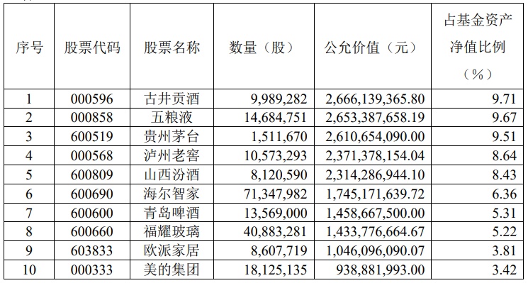 前十大重仓股分别为:古井贡酒(000596.SZ)、五粮液(000858.SZ)、贵州茅台(600519.SH)、泸州老窖(000568.SZ)、山西汾酒(600809.SH)、海尔智家(600690.SH)、青岛啤酒(600600.SH)、福耀玻璃(600660.SH)、欧派家居(603833.SH)、美的集团(000333.SZ)。