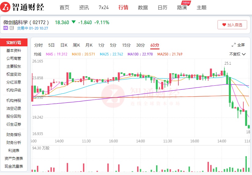 1月19日,微创脑科学股价走出12.93%的上市以来最大单日跌幅,截至收盘股价为20.2港元,20日开盘再度下跌9.41%。消息面上,公司几日前刚刚发布业绩预喜公告,却并未为股价带来一波上涨动力。