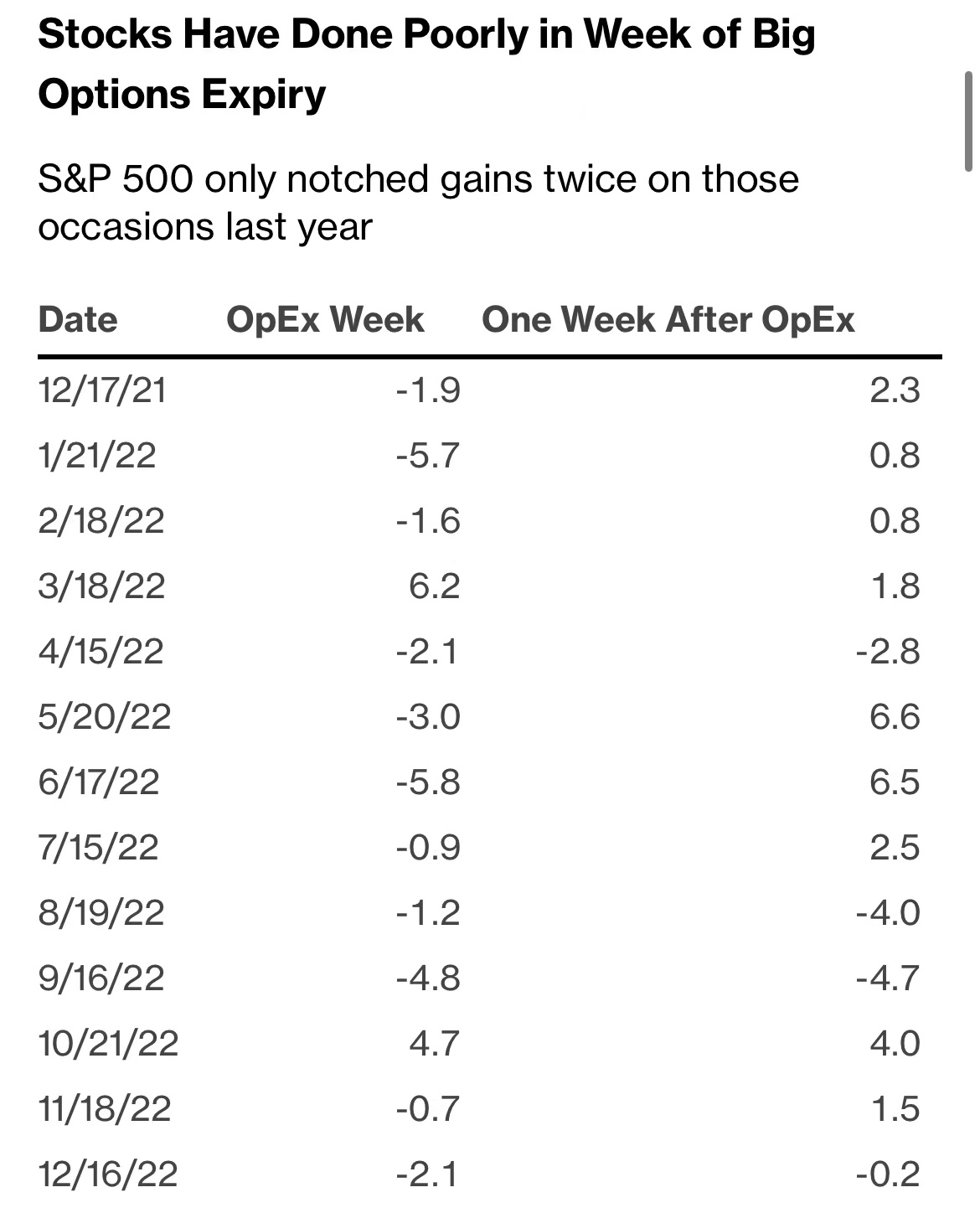 这将使周五成为又一个关键的日子,与指数和个股挂钩的期权持有人将不得不要么展期现有头寸,要么开始新头寸。Susquehanna衍生品策略联席主管Chris Murphy表示,鉴于这一过程通常会提高交易量,交易员可能选择在去年熊市期间利用这一机会退出股市,这导致期权到期周对股市不利。