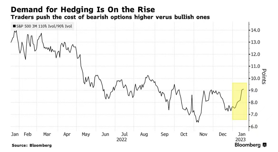 对冲的需求已经在慢慢上升。标普500指数的偏度(衡量看跌期权与看涨期权的相对成本)最近几周有所上升,触及3个月高点。这与2022年的大部分时间不同,当时该指数偏度持续下降,部分原因是各类投资者在熊市期间削减了他们的股票敞口。
