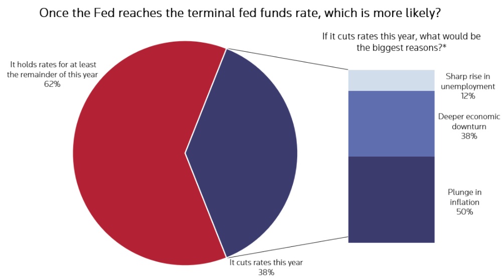 目前,最终利率的预期将是上一轮紧缩周期峰值的两倍多,也是2007年年中全球金融危机爆发前以来的最高水平。对于美联储2023年底的政策利率将在哪里,市场没有明确的共识,但约三分之二的受访者预测利率将在4.75%-5.00%或更高的水平。