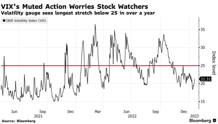 VIX上一次在这么长时间内处于如此低位是在2021年,彼时围绕美联储缩减刺激措施的猜测帮助控制住了标普500指数长达七个月的上涨。而目前市场正值自2008年以来最糟糕的一年开始反弹之际,于2022年美联储七次加息后,市场投资者的注意力似乎正在转移。