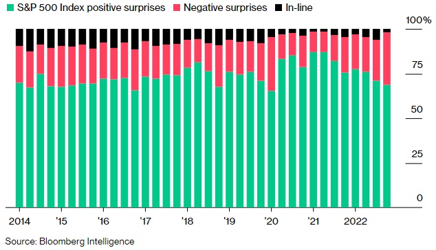 (标普500指数成分股中收益,超出、未达到或符合分析师每股收益预期的比例)