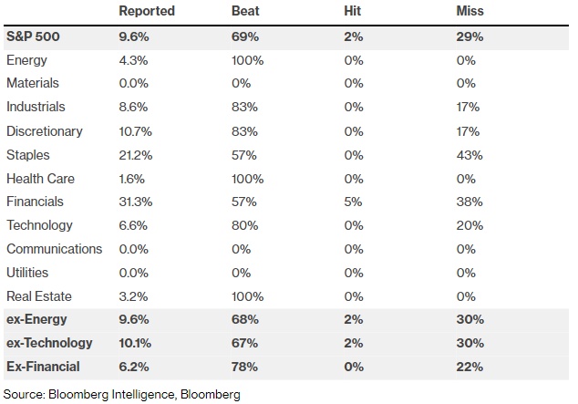 (标普500指数成分股中已公布财报的行业业绩超出、符合或未达到分析师预期的比例)