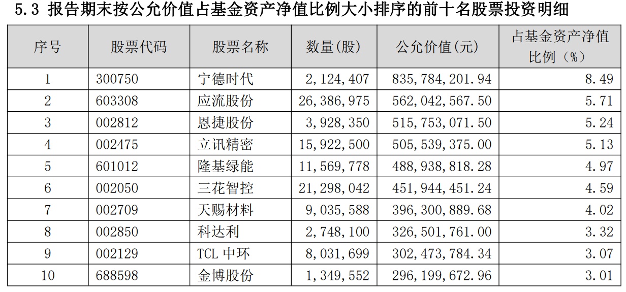 四季报显示,自2022年10月18日成立后,泉果旭源逢低布局,稳步建仓。截至2022年12月31日,权益仓位达67.24%,组合持仓主要集中在电力设备新能源、计算机、电子、机械、军工等高端制造行业,以及后疫情时代复苏的消费行业等。具体到前十大重仓股的持仓来看,宁德时代(300750.SZ)为该产品第一大重仓股,持股市值达8.36亿元,占基金资产净值比例为8.49%;其次为应流股份(603308.SH)、恩捷股份(002812.SZ)、立讯精密(002475.SZ)、隆基绿能(601012.SH)、三花智控(002050.SZ)、天赐材料(002709.SZ)、科达利(002850.SZ)、TCL中环(002129.SZ)、金博股份(688598.SH)。