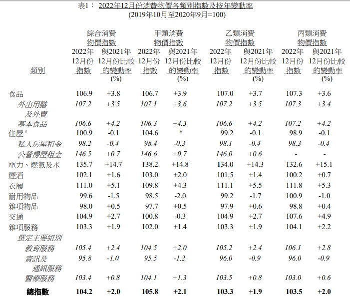 2022年全年计,综合消费物价指数较一年前同期上升1.9%,甲类、乙类及丙类消费物价指数的相应升幅分别为2.2%、1.7%及1.8%。剔除所有政府一次性纾困措施的影响,相应升幅则分别为1.7%、1.7%、1.7%及1.8%。