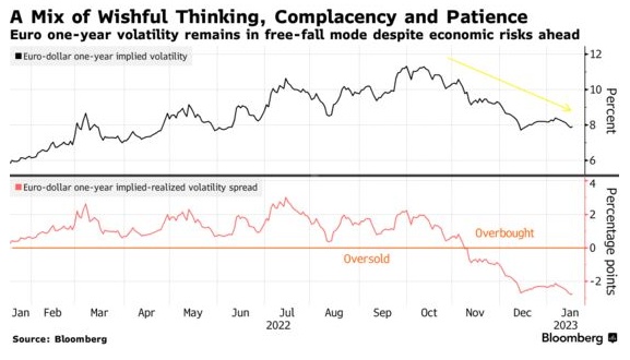 智通财经APP获悉,在经历了动荡的2022年之后,欧元的波动已经平静下来,以有史以来最快的速度下滑。这导致一些外汇投资者认为,开始押注汇率波动加大是值得的。全球投资者一致认为,由于通胀正在缓解,美联储也开始放松加息力度,外汇市场的形势将会平静下来。然而,欧洲政策制定者一直在释放鹰派信号,为欧元再次出现剧烈波动埋下伏笔。