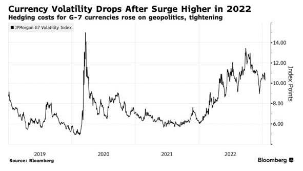 根据摩根大通公司的指数衡量,全球汇率波动率在2022年第四季度以疫情爆发以来最快的速度下滑后,今年有所下降。对于欧元来说,这是一个更剧烈的波动——隐含波动率的季度下滑是有记录以来最大的。
